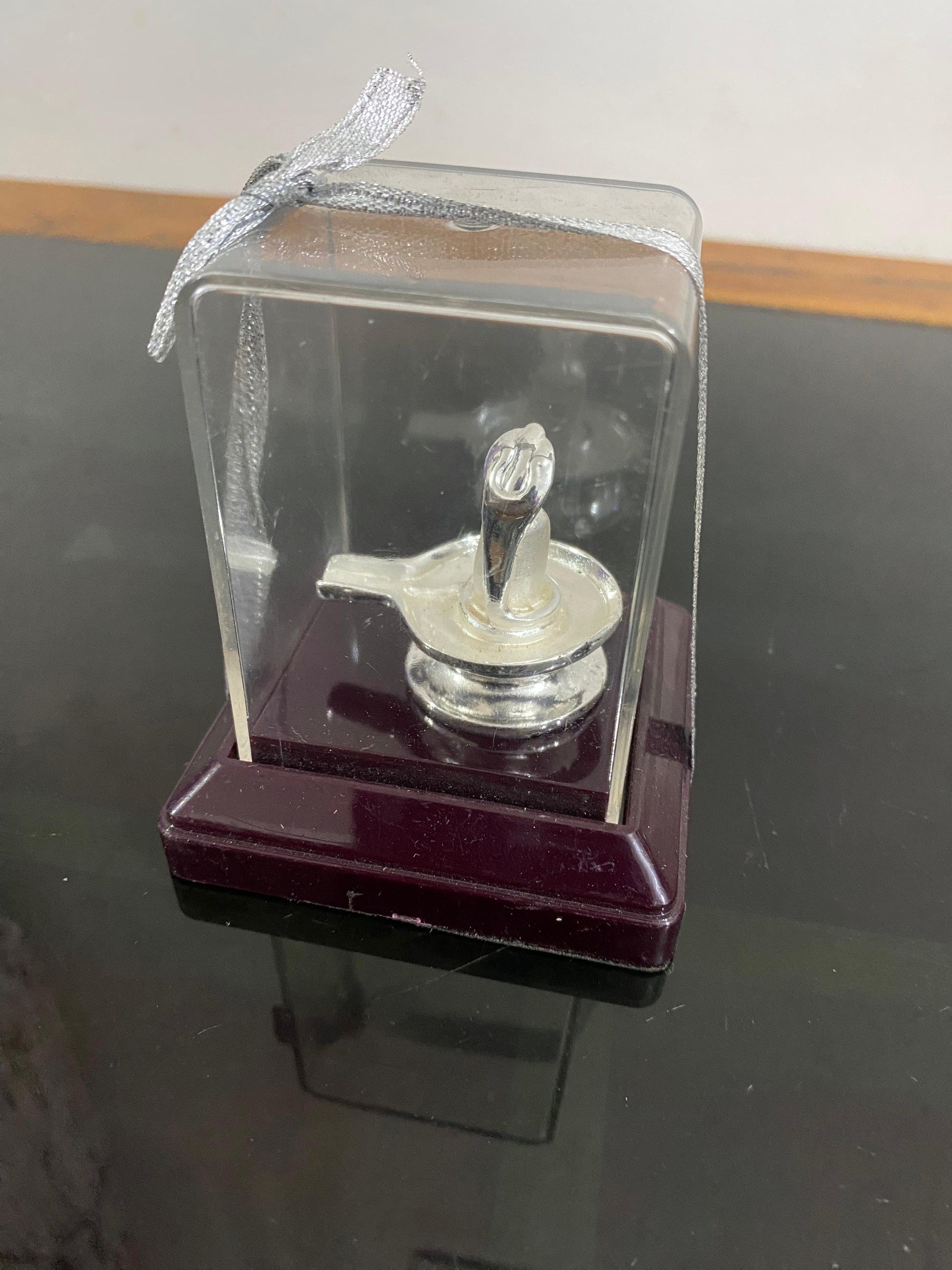 • Material: Silver Shivling with acrylic box cover and wooden base